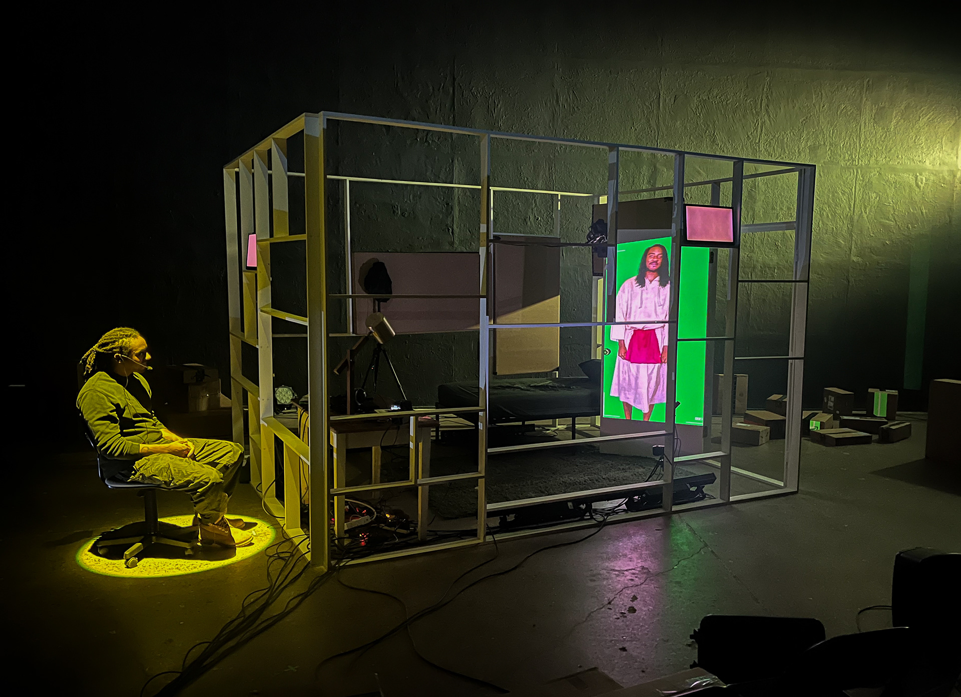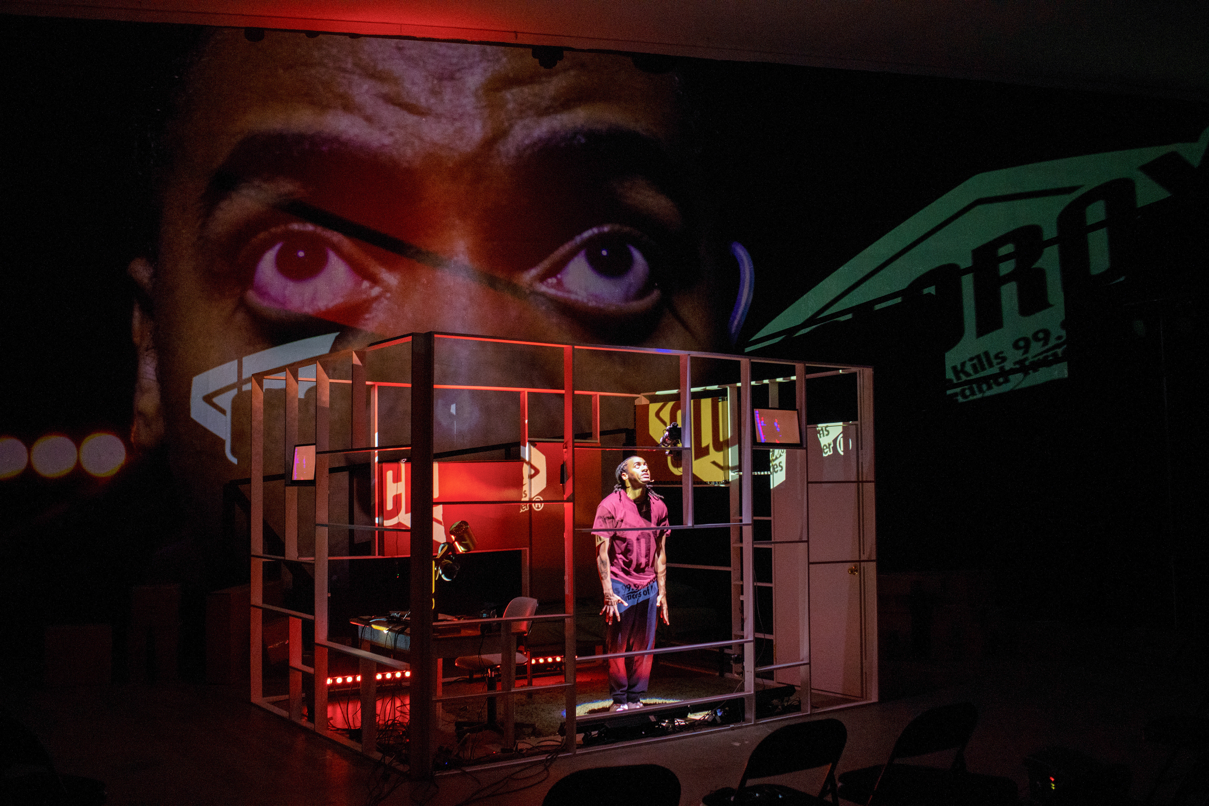 Gabardine is a works-in-process, poetic performance exploring Black grief, shame and joy through a triptych of acts: self-destruction, self-preservation and self-care. This experimental show utilizes film, projection, immersive sound and various technologies to subvert audience expectations.